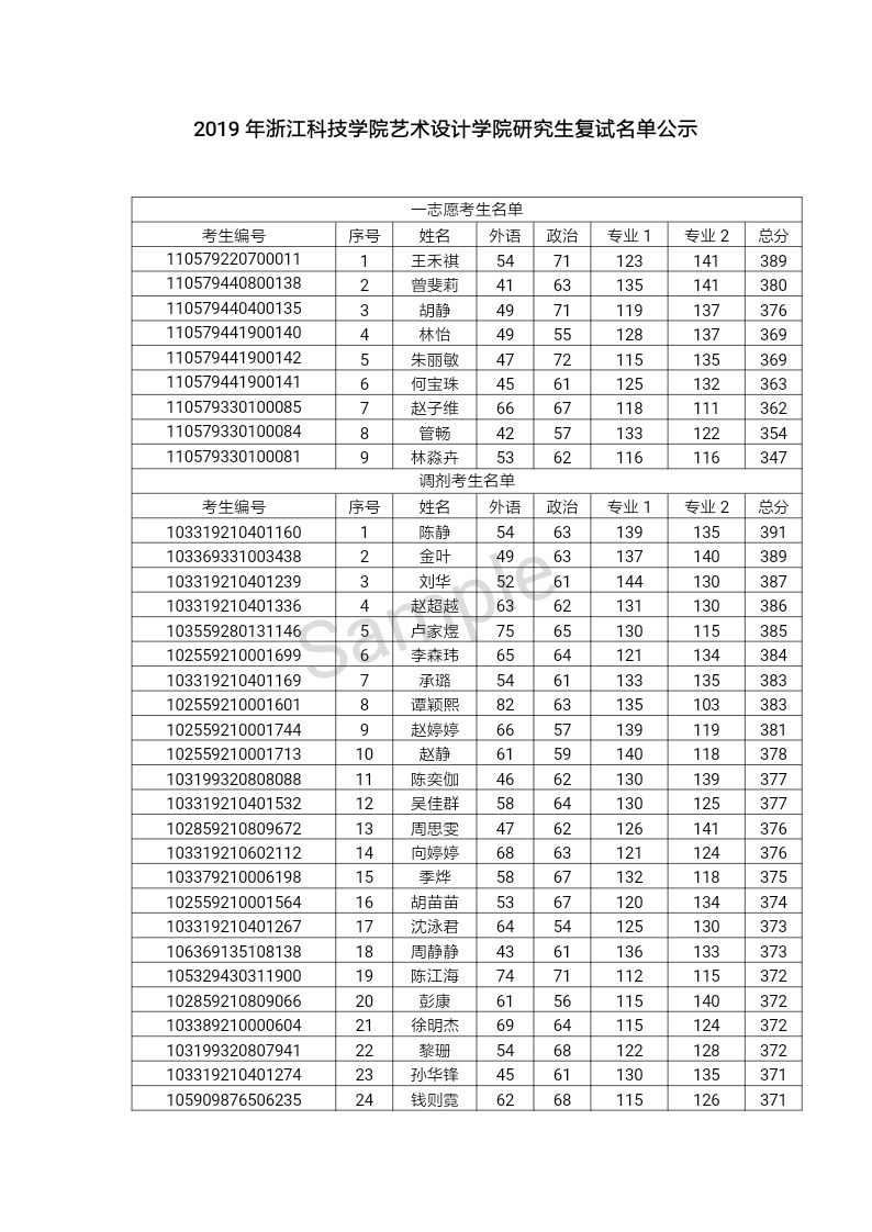 2019年浙江科技91麻豆 91麻豆 研究生复试名单