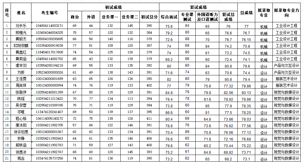 备注:复试成绩(满分100分)=综合面试×50%+专业课测试×30%+外语听力及口语测试×20%;总成绩(满分100分)=(初试成绩/5)×50%+复试成绩×50%。