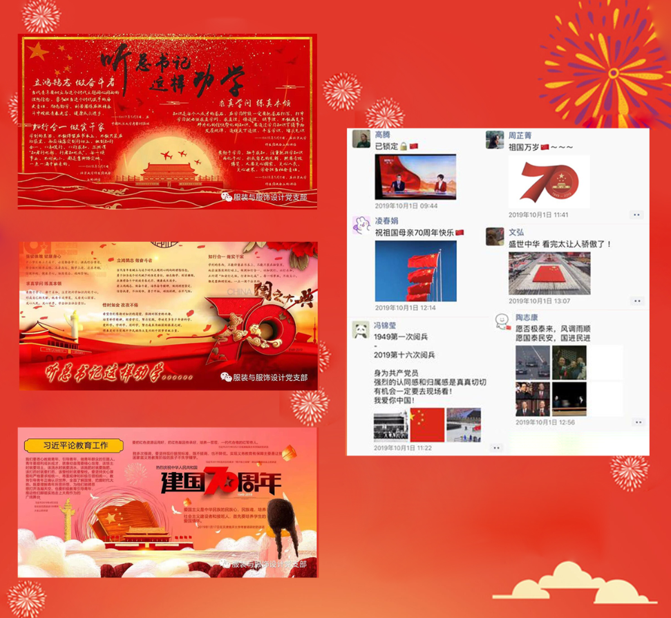 各支部纷纷开展丰富多彩的庆祝活动,各支部组织党员和入党积极分子一起观看70周年阅兵式、共和国勋章授勋仪式,教工第三支部和学生第三、第六支部还发起了观后感言等活动;结合“对标先进比学”的要求,各个支部先后学习全国优秀党员、时代楷模等先进模范,学生第四支部还特色开展寻找校园师生榜样,彰显榜样风采活动;各党支部结合国庆活动花式告白祖国,学生第五支部开展“我和国旗合个影”活动;学生第一支部、第四支部参与设计专题横幅、海报,进行庆祝宣传;学生第二支部拍摄普通人民对祖国的祝福视频等,师生们都在用着不同的方式,表达对祖国最美好的祝福。