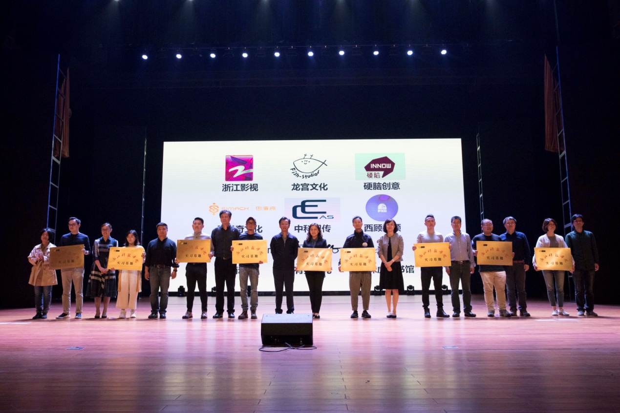党委副书记符宁平、院党委书记詹俊、院长郑林欣及校院各级领导为浙江影视频道等9个动画系新增实习基地授牌。院长郑林欣作开场致辞。副院长吴春胜为系标设计者裘孟晨同学颁发证书。