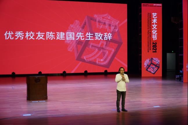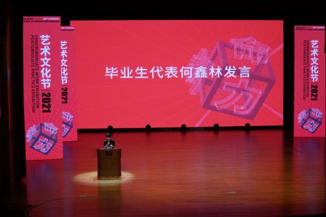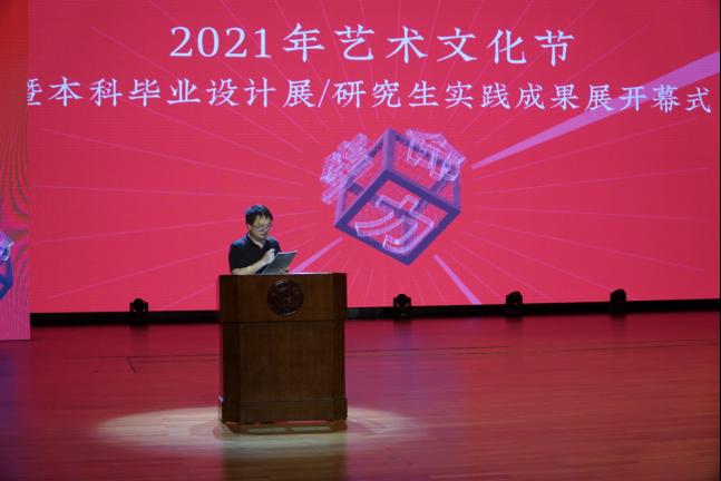 向与会领导、嘉宾表示欢迎与感谢,对同学们四年以来的成绩做出了肯定。优秀校友代表陈建国先生发表了热情洋溢的讲话,以自身工作学习经验给在场学弟学妹们提供了宝贵建议,并祝愿即将毕业的同学们在未来的职业道路上能一帆风顺,祝愿母校越来越好。优秀毕业生代表何鑫林回顾了大学四年以来学习和生活的点滴,对母校与老师们表达了深深的感激和不舍之情,鼓励同学们在艺术的道路上勇敢前行,积极展望未来。