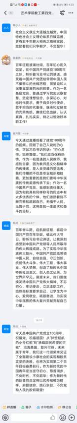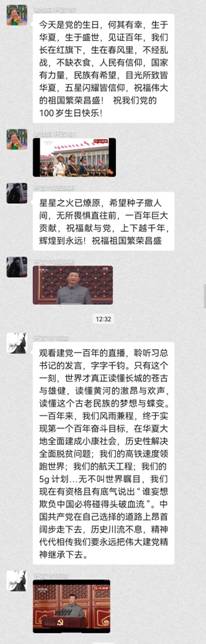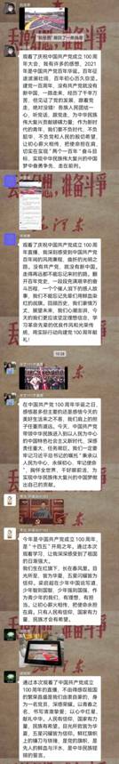 党委班子和师生党员代表观看直播,并组织师生通过支部组织生活会、系部政治理论学习等形式多层次、多途径观看大会,认真聆听习近平总书记在庆祝中国共产党成立100周年大会上的重要讲话,共同庆祝中国共产党成立100周年。期间,师生们在群里纷纷为党的生日献上诚挚的祝福并书写下自己的心得体会。