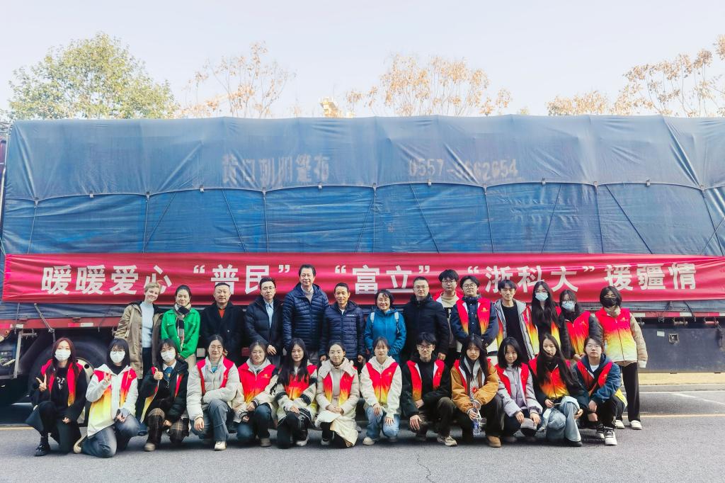 、杭州普民服饰有限公司、浙江富立针织科技有限公司三方合作的紧密性。他们将援疆行动融入到校企合作中,共同承担社会责任,通过实际行动传递关爱和温暖,为新疆的学子和村民送去一份来自浙江的心意。