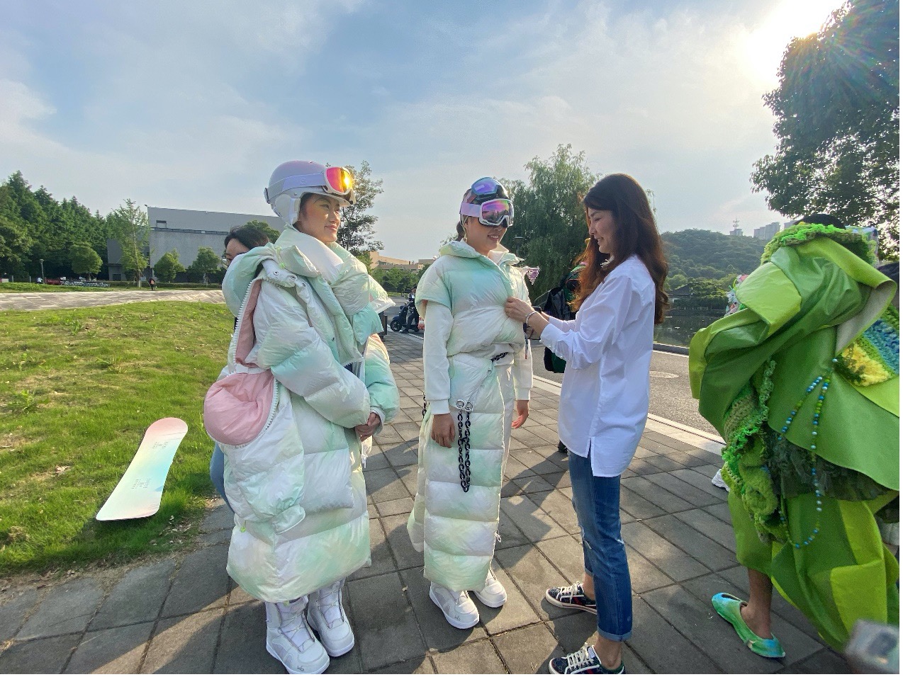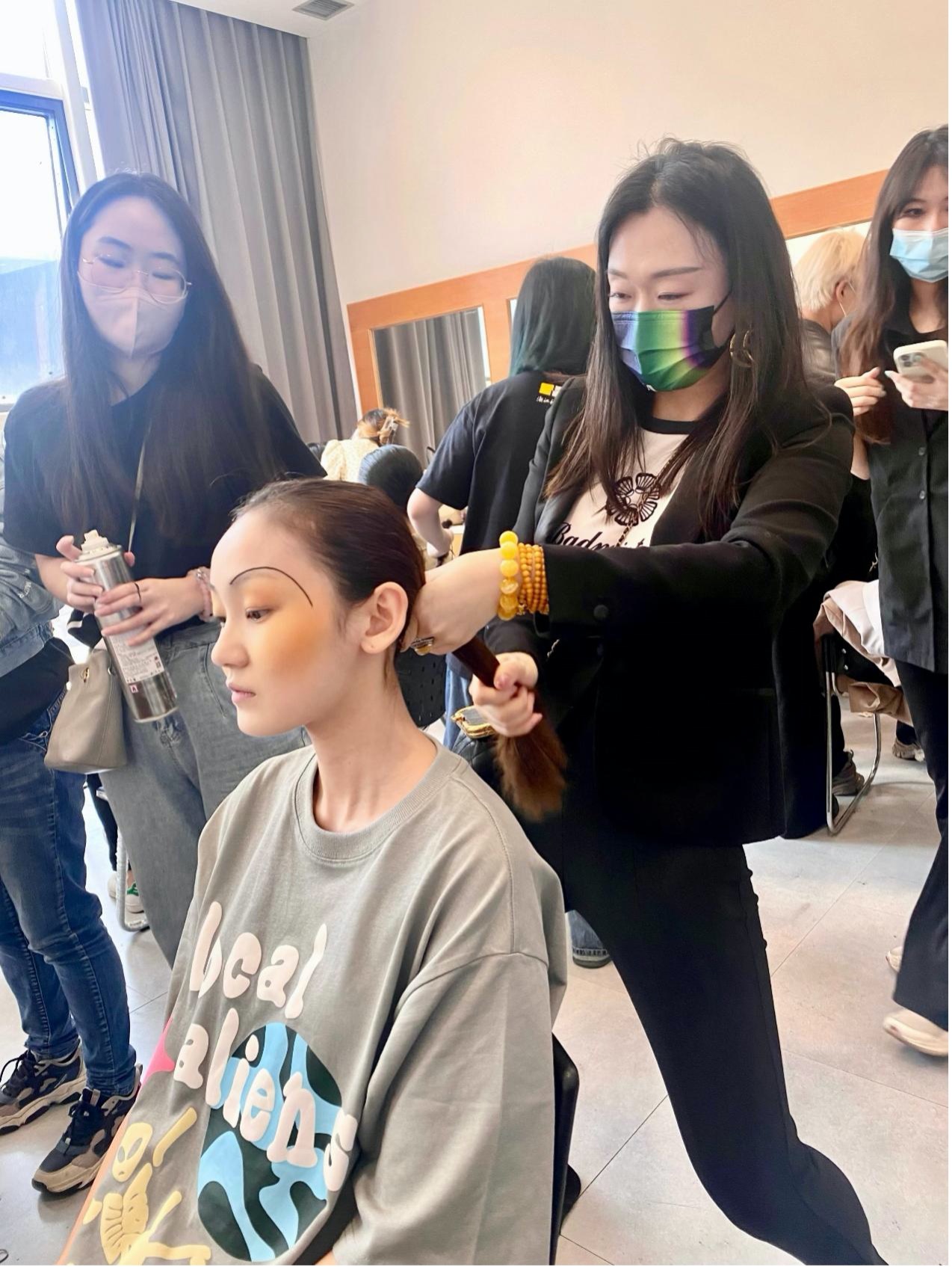 “时创美学”团队的女教师们结合自身专业及资源优势,从设计、策划、试装、后台、妆面造型、视频各方面严格把控,亲力亲为,从教学科研和文化生活两个角度贡献出“巾帼文明岗”的力量,最终顺利完成本次视频的录制工作。